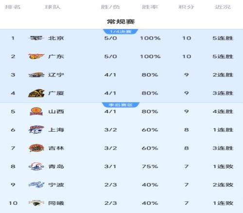 从以上积分榜来看,北京队、广东队继续保持全胜,辽宁队、广厦队都是4胜1负,分列第三、第四,另外全败的球队仅剩天津队、四川队,江苏队已经拿到了首场胜利。作为昔日的总冠军,四川队本轮比赛遭遇51分的惨败,继续沦为垫底位置。
