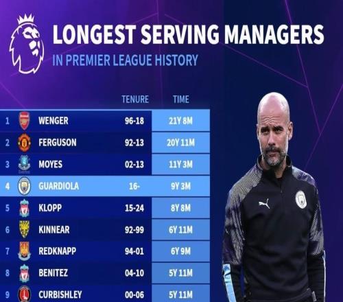 英超历史主帅在位时长:温格、弗格森前2,瓜帅第4,塔帅第10